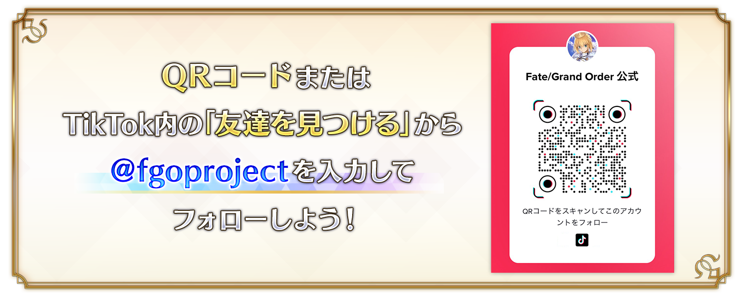 QRコードまたはTikTok内の「友達を見つける」から「@fgoproject」を入力してフォローすることができます。