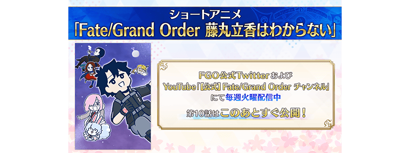 ショートアニメ「Fate/Grand Order 藤丸立香はわからない」は、毎週火曜日にFGO公式TwitterおよびYouTube「【公式】Fate/Grand Order チャンネル」にて配信中!