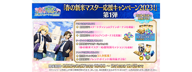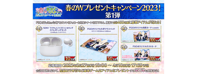 また、Fate/Grand OrderのTwitter公式アカウントをフォロー&リツイートしていただいた方を対象に、抽選で合計460名様に豪華プレゼントが当たる「春のWプレゼントキャンペーン2023!」第1弾を実施いたします。