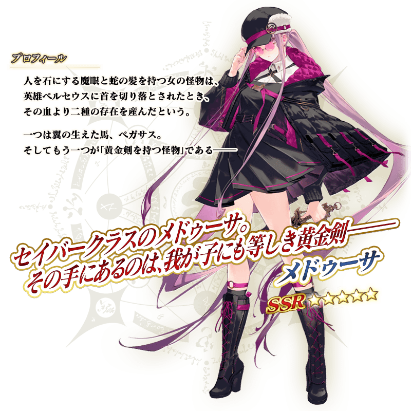 新登場の期間限定サーヴァント「★5(SSR) メドゥーサ(セイバー)」をピックアップいたします。
