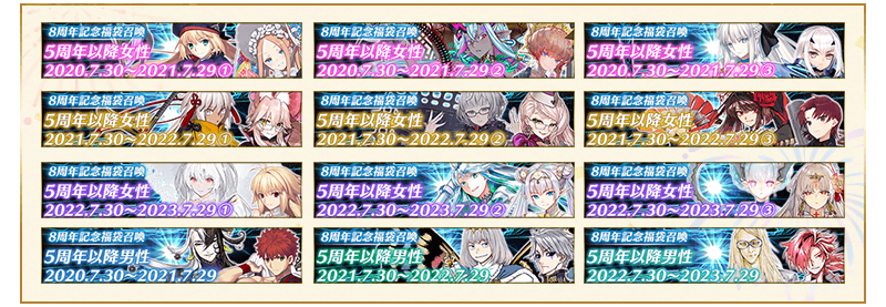 5周年以降に登場したサーヴァントを「男女×リリース順」に全12種類のグループに分けた中から、いずれか1つのみ召喚可能となる「8周年記念福袋召喚(5周年以降 男女×リリース順12分割)」の開催を発表いたしました。