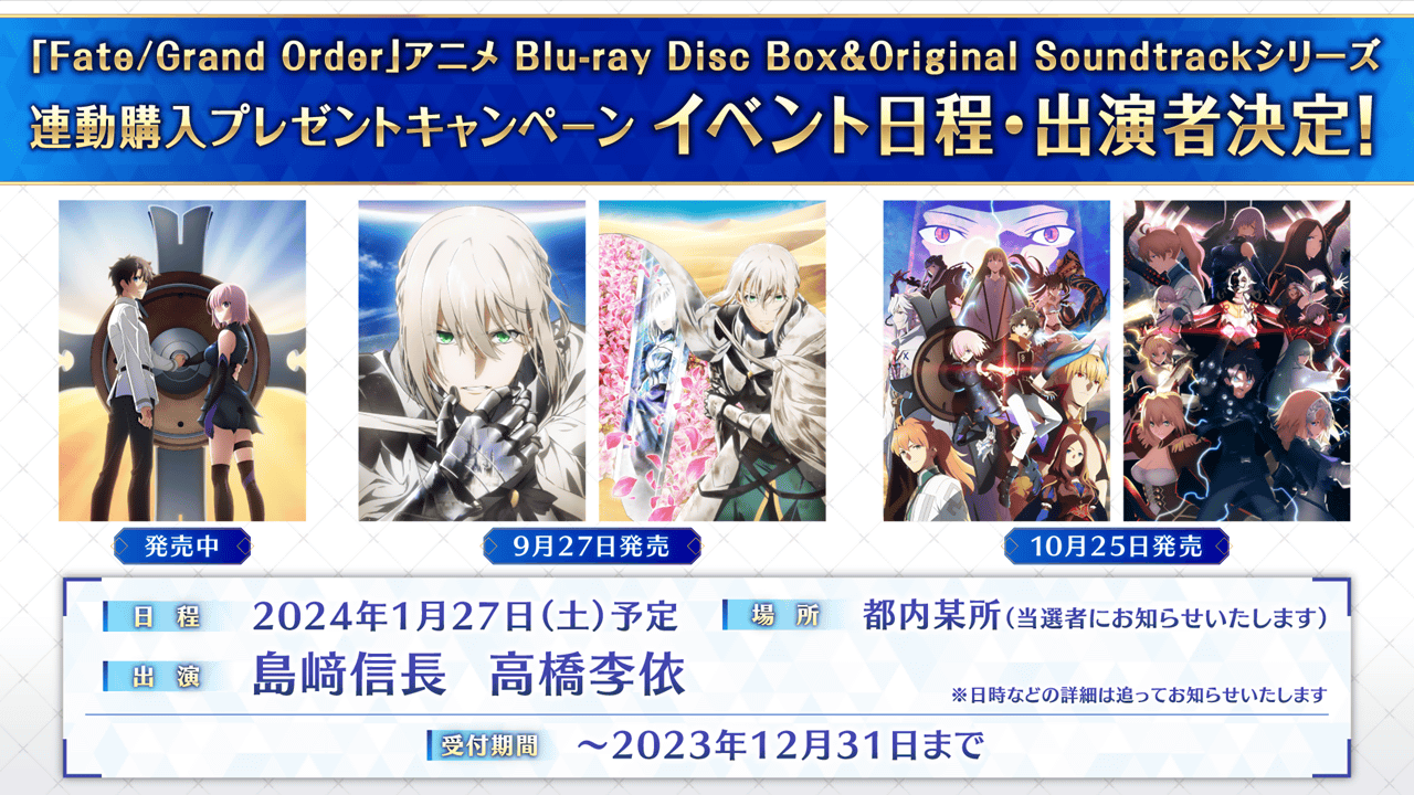 「Fate/Grand Order」アニメ Blu-ray Disc Box& Original Soundtrackシリーズ連動購入プレゼントキャンペーン のイベント日程と出演者が決定いたしました。