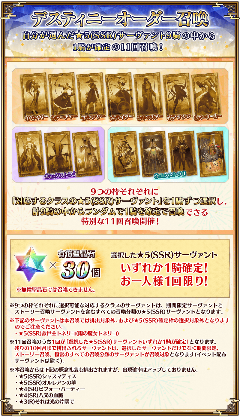 自分が選んだ★5(SSR)サーヴァント9騎の中から1騎が確定の11回召喚をすることができる【期間限定】「デスティニーオーダー召喚」の開催を発表いたしました。