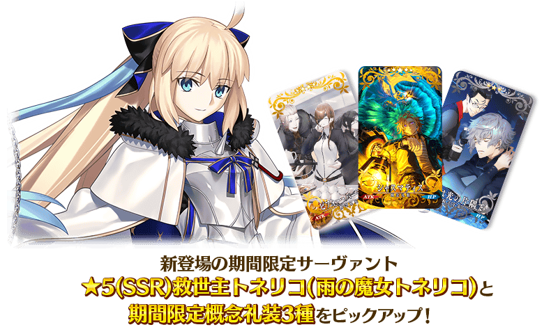 新登場の期間限定サーヴァント「★5(SSR)救世主トネリコ(雨の魔女トネリコ)」と期間限定概念礼装3種をピップアップいたします。