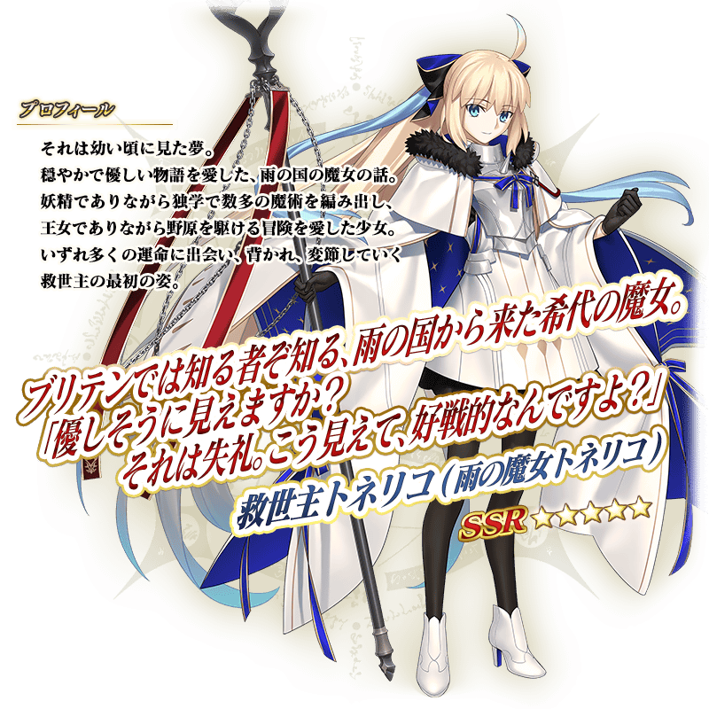 ※上記の「★5(SSR)救世主トネリコ(雨の魔女トネリコ)」のイラストは霊基再臨第2段階のものです。