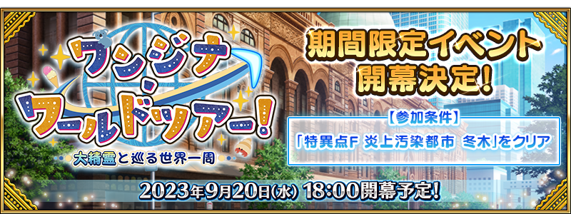 期間限定イベント「ワンジナ・ワールドツアー! ~大精霊と巡る世界一周~」が2023年9月20日(水) 18:00より開幕予定であることを発表いたしました。