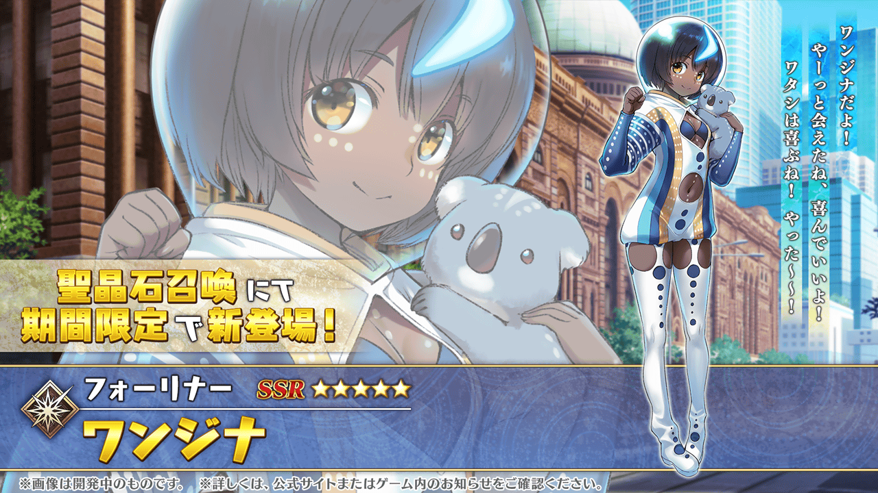 新登場の期間限定サーヴァント「★5(SSR) ワンジナ」と期間限定概念礼装「★5(SSR) リフ・レイン」、「★4(SR) スマイル・ナイト」、「★3(R) まだ旅の途中」をピックアップした聖晶石召喚の開催を予定しております。