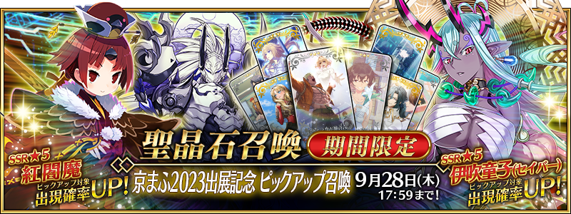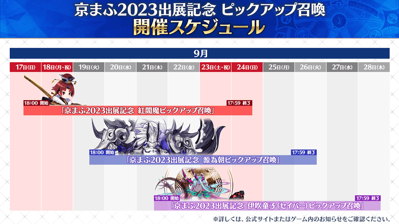 「京まふ2023」への出展を記念して、期間限定サーヴァント「★5(SSR)伊吹童子(セイバー)」、「★5(SSR)紅閻魔」と恒常サーヴァント「★5(SSR)源為朝」をピックアップする3種類の聖晶石召喚の開催を予定しております。