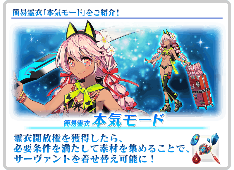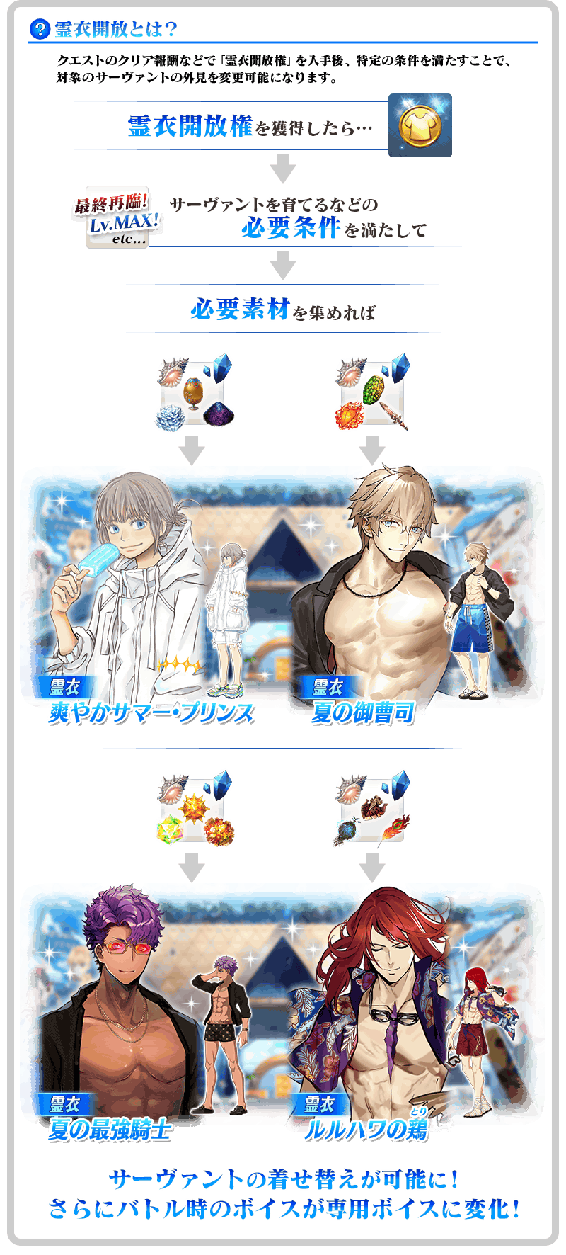 ※「★5(SSR)オベロン」「★4(SR)ガウェイン」「★4(SR)ランスロット(セイバー)」「★4(SR)トリスタン」の霊衣開放権は、期間限定イベント「サーヴァント・サマー・フェスティバル2023!」のイベントアイテム交換期間のみ入手可能です。