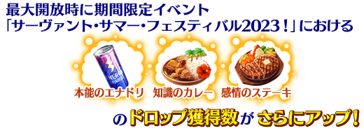 また、イベント限定概念礼装「★5(SSR)泡沫の彼方」を装備することで、イベントアイテム「本能のエナドリ」「知識のカレー」「感情のステーキ」それぞれのドロップ獲得数がアップします。