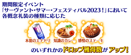 イベントの進行で複数種の★4(SR)のイベント限定概念礼装を入手できることがあり、装備することでイベントアイテム「本能のエナドリ」「知識のカレー」「感情のステーキ」のうち各概念礼装の種類に応じたイベントアイテムのドロップ獲得数がアップします。