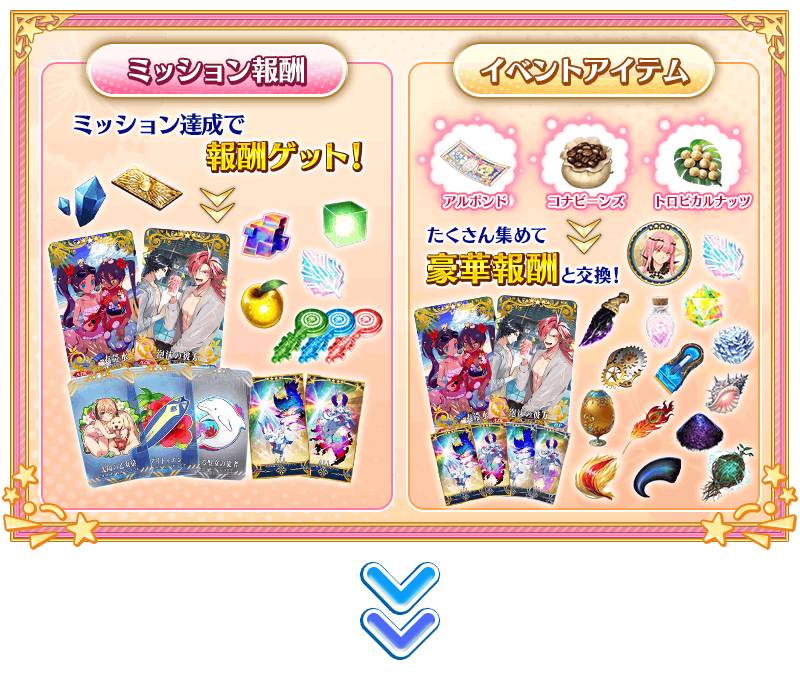 さらに、聖晶石召喚にてピックアップされる期間限定概念礼装「★5(SSR)ダズリング・ムーン」「★5(SSR)サマー・ブレイク」「★4(SR)カクタス・シティ」「★4(SR)ラウンズ・ビーチ」「★3(R)波濤を越えて」「★3(R)病める時も健やかなる時も」を装備することで、イベントアイテム「アルポンド」「コナビーンズ」「トロピカルナッツ」それぞれのドロップ獲得数がアップします。
