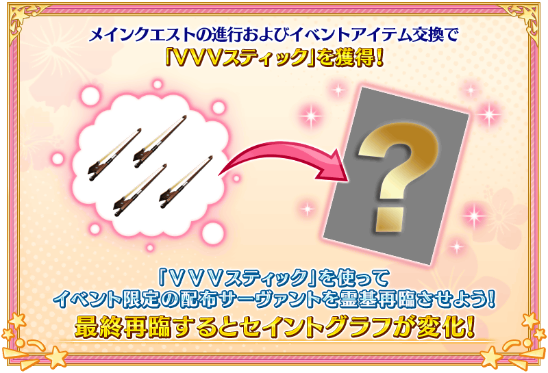 メインクエストの進行およびイベントアイテム交換で入手可能な「VVVスティック」を使って、霊基再臨を4回繰り返すと、セイントグラフに変化が!