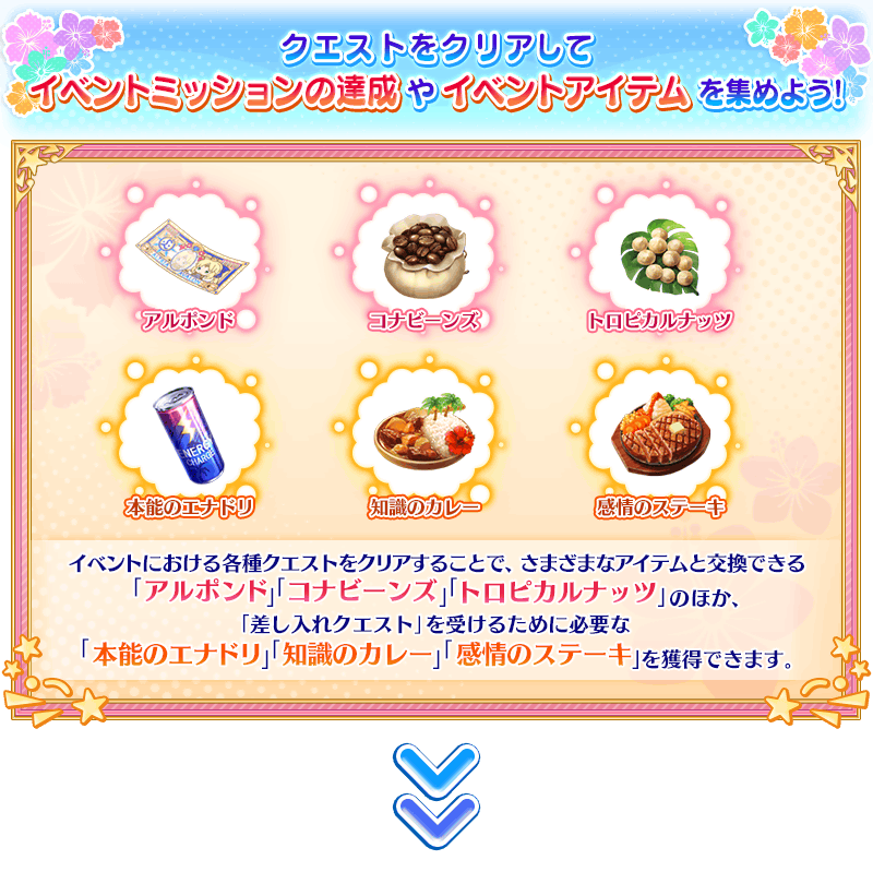 ※イベントアイテム交換期間終了後「ソーダアイス」「アルポンド」「コナビーンズ」「トロピカルナッツ」「本能のエナドリ」「知識のカレー」「感情のステーキ」は消滅します。
