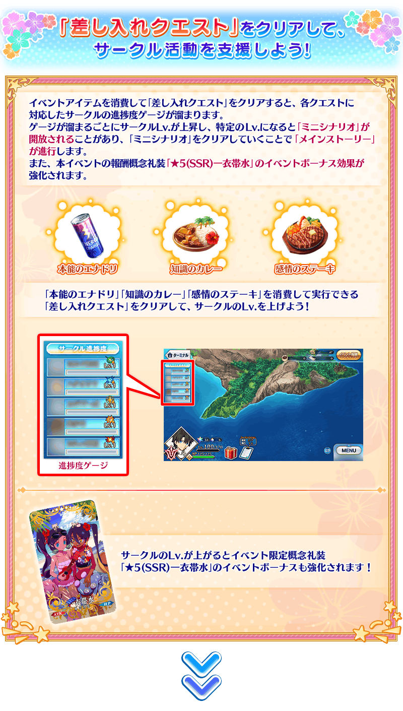 また、紐づくメインクエストをクリアすることで、イベントアイテムを集められるフリークエストのほか、「差し入れクエスト」「ミニシナリオ」も開放されます。