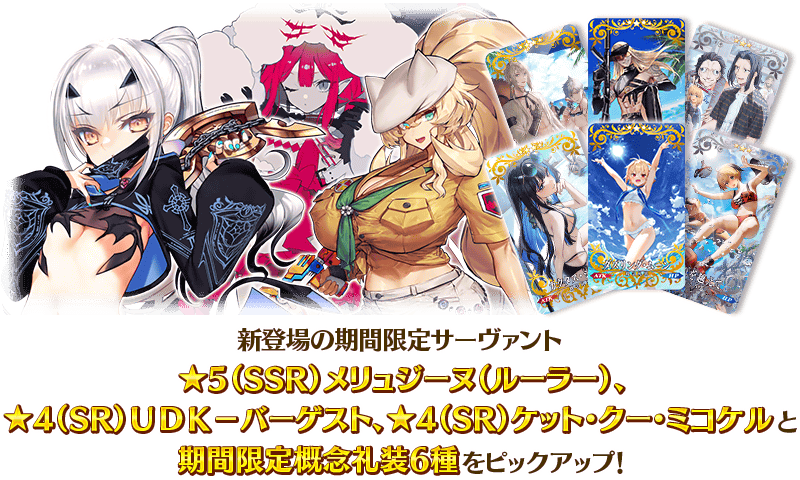 期間限定イベント「サーヴァント・サマー・フェスティバル2023!」の開幕を記念して、新登場の期間限定サーヴァント「★5(SSR)メリュジーヌ(ルーラー)」、「★4(SR)UDK-バーゲスト」、「★4(SR)ケット・クー・ミコケル」と期間限定概念礼装6種をピックアップ!