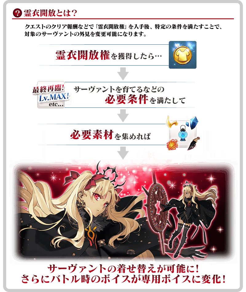 ※「霊衣開放」後は自動でバトルキャラやフェイス画像が切り替わります。「霊衣開放」前の状態に戻したい場合や、他の再臨段階に変更したい場合は、サーヴァント詳細画面より変更することができます。 ※「霊衣開放」をおこなってもクラスやパラメータなどに変化はありません。