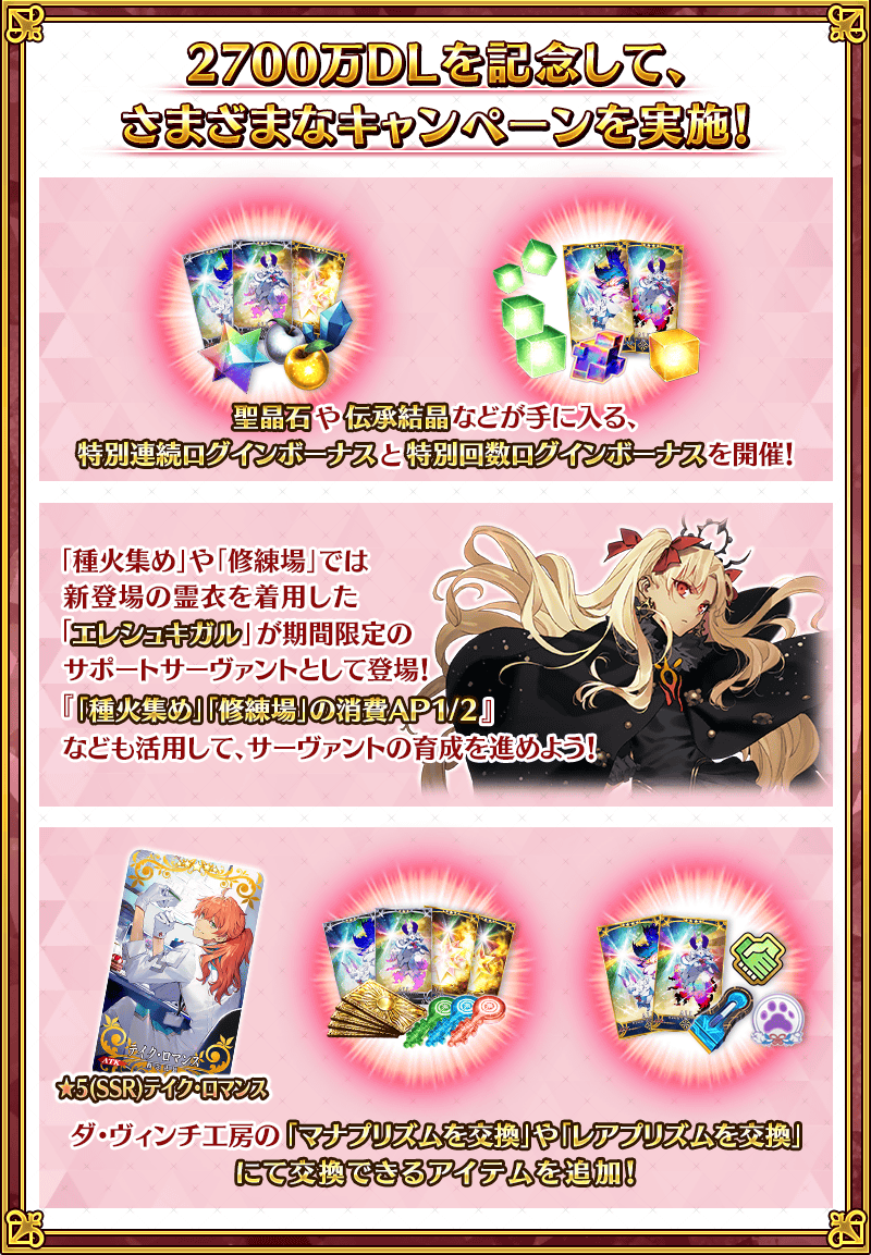 「2700万DL突破キャンペーン」開催を記念して、ダ・ヴィンチ工房の「レアプリズムを交換」に、『マナプリズム交換「テイク・ロマンス」開放権』を恒常追加いたします。