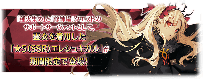 期間限定で「種火集め」と「修練場」クエストにサポートサーヴァントとして「★5(SSR)エレシュキガル」が登場します!