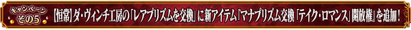 【ダ・ヴィンチ工房が充実】 ■ダ・ヴィンチ工房の「マナプリズムを交換」に期間限定アイテムを追加! ■ダ・ヴィンチ工房の「レアプリズムを交換」に期間限定アイテムを追加! ■【恒常】ダ・ヴィンチ工房の「レアプリズムを交換」に新アイテム『マナプリズム交換「テイク・ロマンス」開放権』を追加!