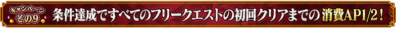 下記の期間中、条件を満たしたマスターを対象に、すべてのフリークエストの初回クリアまでの消費APが1/2になります!(バトルにおいて撤退した場合でも、同様の消費量になります)