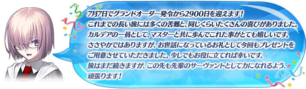 2023年7月7日(金) 0:00~23:59の期間中、ログインをおこなった初回のタイミングに、プレゼントボックスに贈られます。