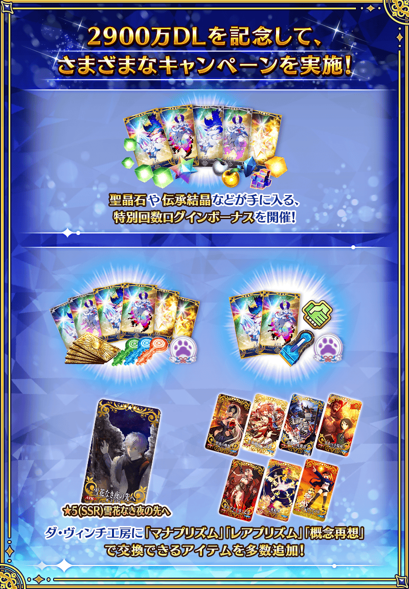 「2900万DL突破キャンペーン」開催を記念して、ダ・ヴィンチ工房の「レアプリズムを交換」に、『マナプリズム交換「雪花なき夜の先へ」開放権』を恒常追加いたします。