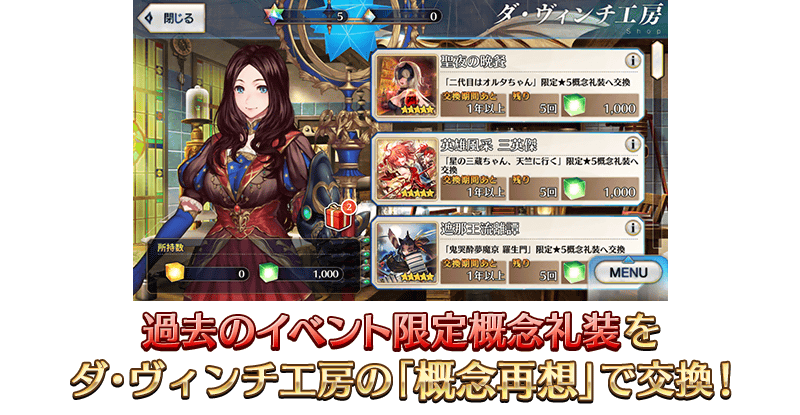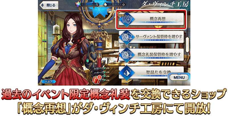 ダ・ヴィンチ工房の「マナプリズムを交換」「レアプリズムを交換」で交換対象となっていたイベント限定概念礼装をまとめたショップ「概念再想」が、ダ・ヴィンチ工房内にて新たに開放されました。
