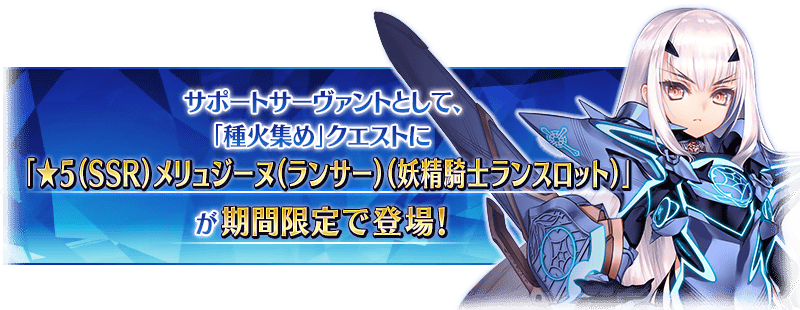 下記の期間中、期間限定で「種火集め」にサポートサーヴァントとして「★5(SSR)メリュジーヌ(ランサー)(妖精騎士ランスロット)」が登場します!