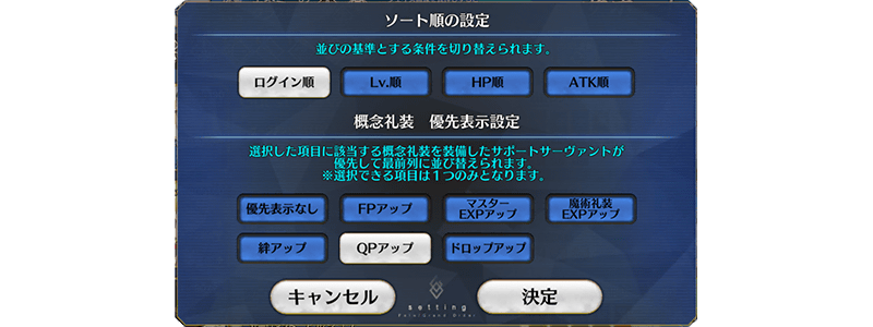 サポート選択画面右上の「ソート」ボタンをタッチすると表示されるダイアログから、「FPアップ」「マスターEXPアップ」など該当の概念礼装を装備しているサーヴァントを優先して表示する設定がおこなえます。