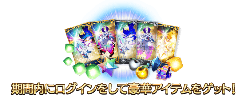 下記期間中に10回ログイン(1日1回カウント)すると、白銀の果実10個、黄金の果実10個、1,000万QP、マナプリズム200個、叡智の業火ALL★5(SSR)20枚、英霊結晶・流星のフォウくんALL★4(HP)1枚、英霊結晶・日輪のフォウくんALL★4(ATK)1枚、英霊結晶・星のフォウくんALL★3(HP)10枚、英霊結晶・太陽のフォウくんALL★3(ATK)10枚、レアプリズム1個、伝承結晶1個、聖晶石30個(聖晶石召喚最大11回分)といった豪華報酬をプレゼント!