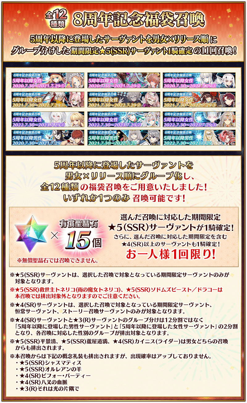 ■有償聖晶石15個で召喚可能な期間限定「8周年記念福袋召喚(5周年以降 男女×リリース順12分割)」が開催!