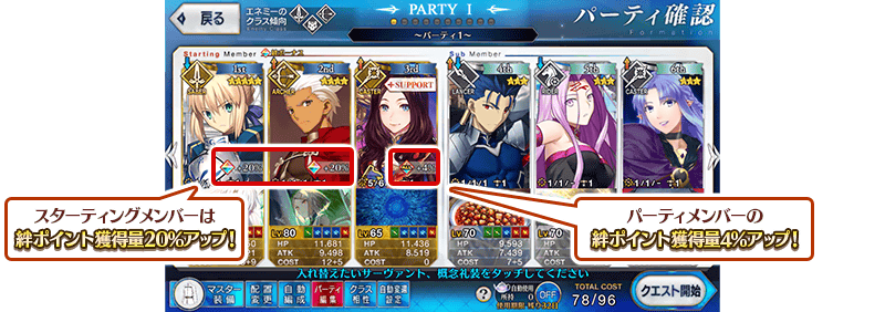 スターティングメンバーの枠にサポートまたはゲストサーヴァントを編成していた場合は、その騎数毎にパーティに編成している自身のサーヴァントの絆ポイント獲得量が4%アップします。