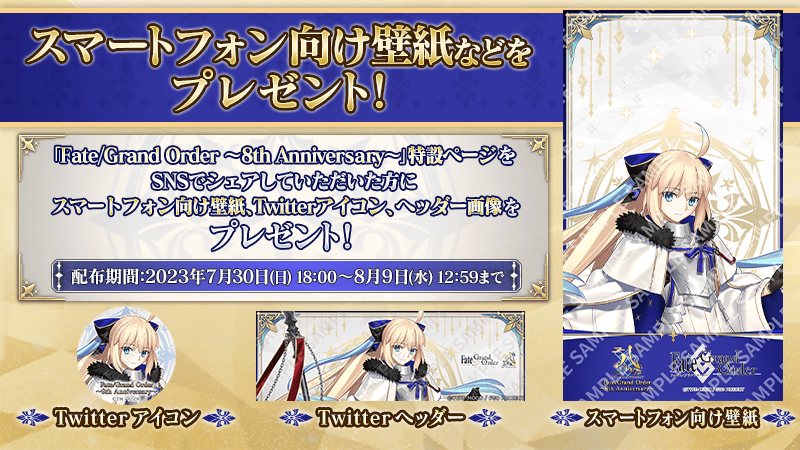 「Fate/Grand Order ~8th Anniversary~」の特設ページにて、スマートフォン向け壁紙、Twitterアイコン、ヘッダー画像のプレゼントを実施中!