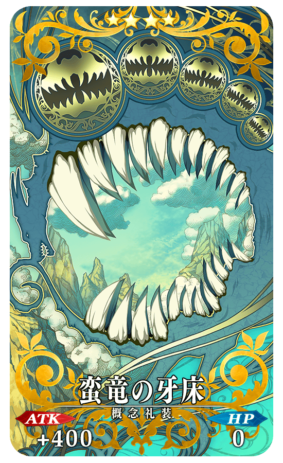 | ドラゴンサロンへようこそ! | 「Lostbelt No.1 永久凍土帝国 アナスタシア 獣国の皇女」をクリア | 概念礼装 ★4(SR)蛮竜の牙床 |