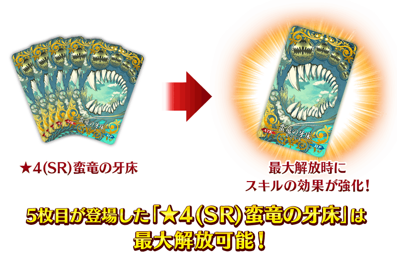 5枚目が登場した「★4(SR)蛮竜の牙床」は、最大解放することでスキルの効果を強化することができます。