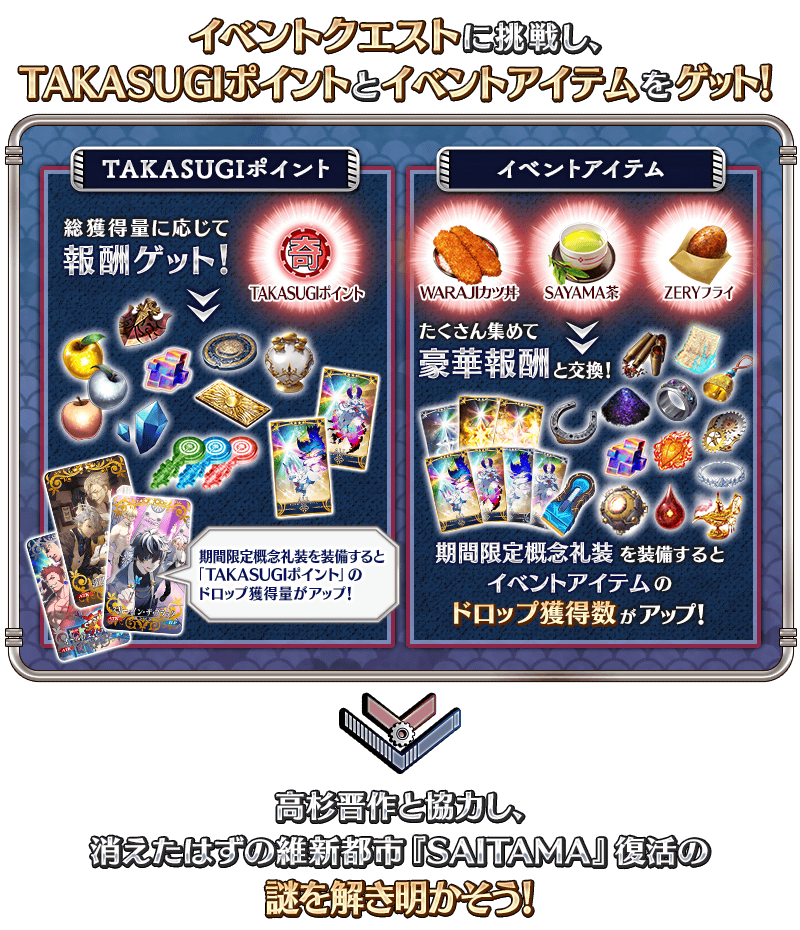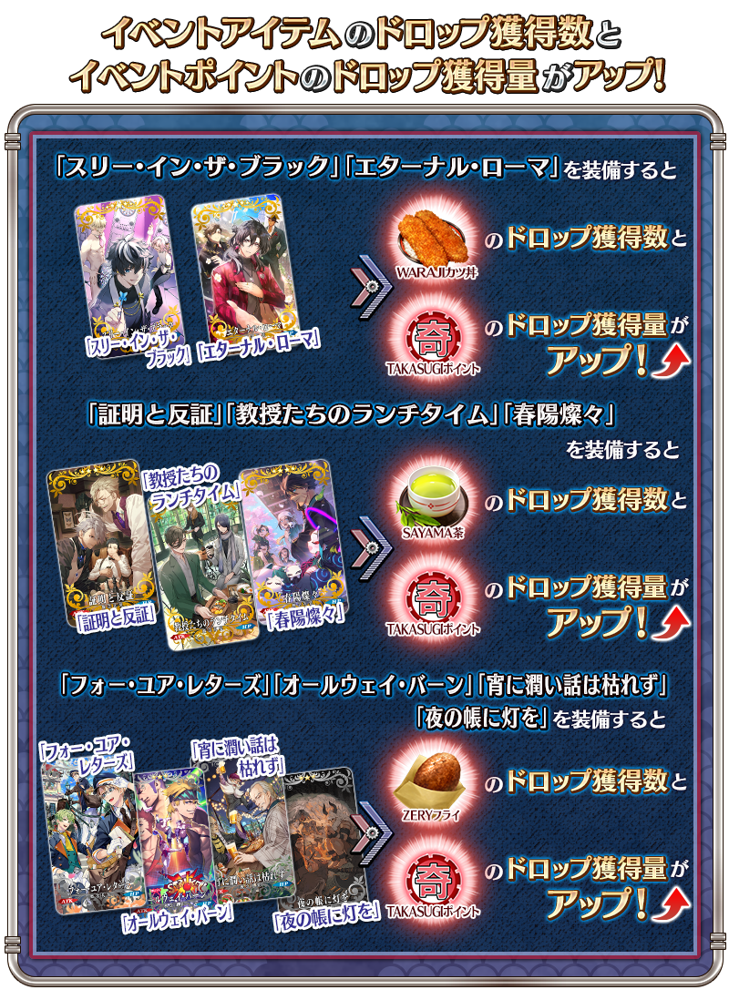 本イベントと同時開催の聖晶石召喚にてピックアップされる期間限定概念礼装「★5(SSR)スリー・イン・ザ・ブラック」「★5(SSR)エターナル・ローマ」「★4(SR)証明と反証」「★4(SR)教授たちのランチタイム」「★4(SR)春陽燦々」「★3(R)フォー・ユア・レターズ」「★3(R)オールウェイ・バーン」「★3(R)宵に潤い話は枯れず」「★3(R)夜の帳に灯を」を装備することで、イベントアイテム「WARAJIカツ丼」「SAYAMA茶」「ZERYフライ」それぞれのドロップ獲得数と、「TAKASUGIポイント」のドロップ獲得量がアップします。