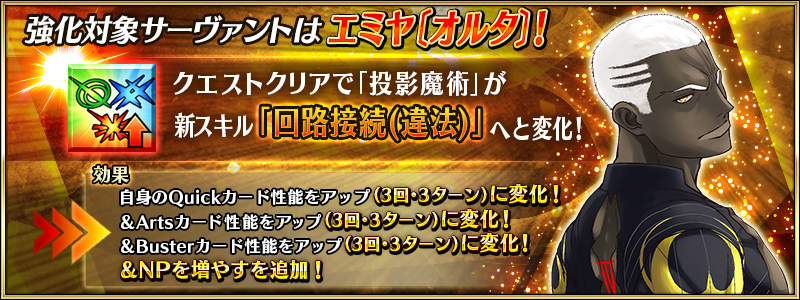 「★4(SR)エミヤ〔オルタ〕」が強化される特別なクエスト「サーヴァント強化クエスト」が、カルデアゲートに恒常的に追加されます。