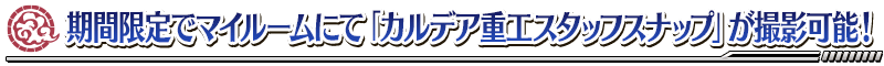 期間限定で、マイルームにて任意のサーヴァントをインスタント写真風に撮影できる「カルデア重工スタッフスナップ」がおこなえるようになるほか、サーヴァントを2騎配置できるようになります。