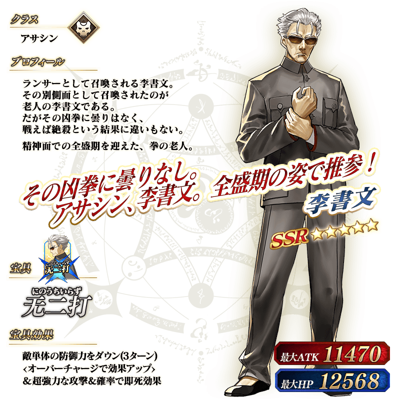 ※上記の「★5(SSR)李書文(アサシン)」のイラストは霊基再臨第2段階のものです。