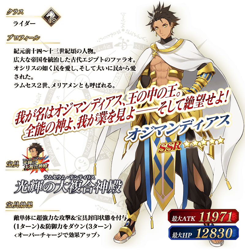 ※上記の「★5(SSR)オジマンディアス」のイラストは霊基再臨第2段階のものです。