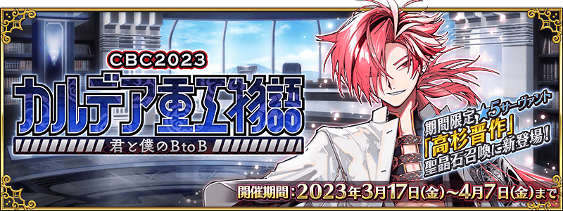 期間限定イベント「CBC2023 カルデア重工物語 ~君と僕のBtoB~」の開幕を記念して、新登場の期間限定サーヴァント「★5(SSR)高杉晋作」を含む2騎のサーヴァントと初回召喚時にボイスが再生される期間限定概念礼装9種をピックアップ!
