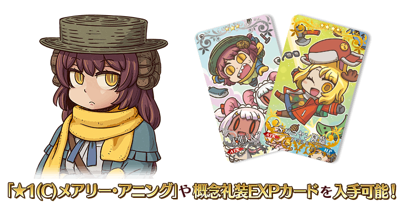 期間限定でフレンドポイント召喚から「★1(C)メアリー・アニング」のほか、概念礼装EXPカード「★4(SR)Sバニヤン降臨」「★3(R)大黒天&アニング降臨」が排出されるようになります!