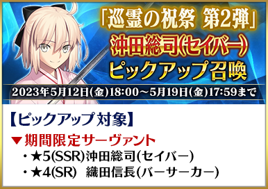 「巡霊の祝祭 第2弾」で追加された4騎と関連するサーヴァントの中から、期間限定サーヴァント4騎を含む6騎をピックアップする3種類の召喚を開催いたします!