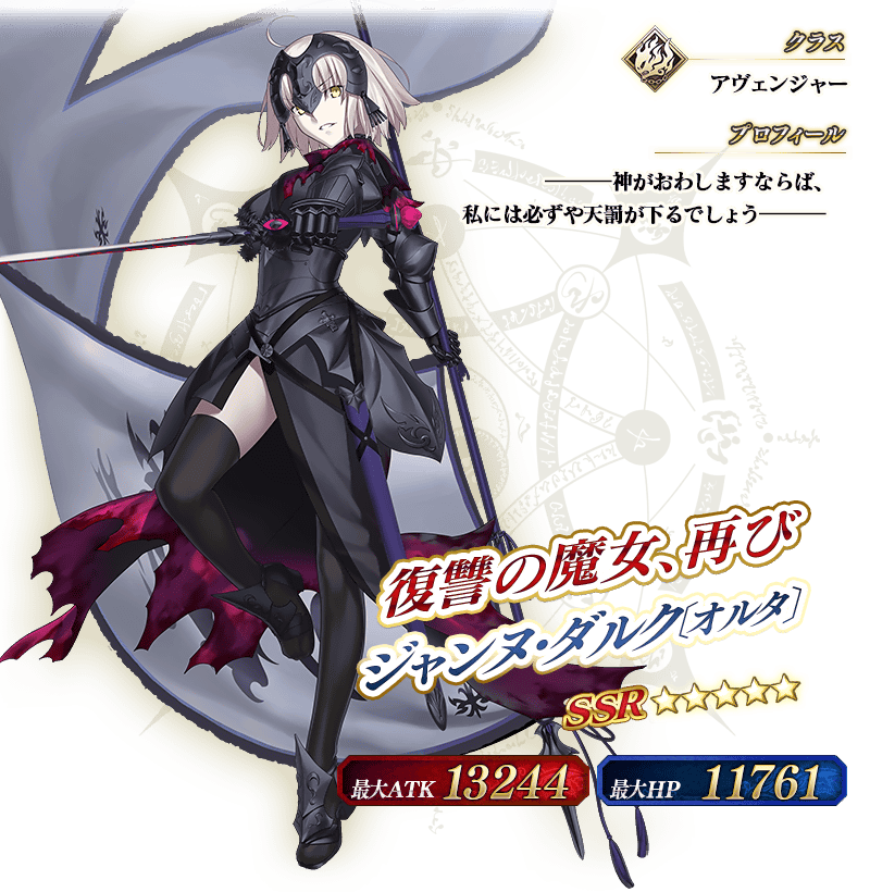 ※上記の「★5(SSR)ジャンヌ・ダルク〔オルタ〕(アヴェンジャー)」のイラストは霊基再臨第2段階のものです。