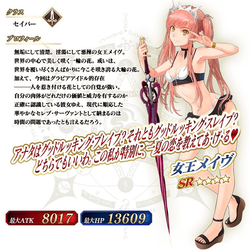 ※上記の「★4(SR)女王メイヴ(セイバー)」のイラストは霊基再臨第2段階のものです。