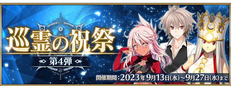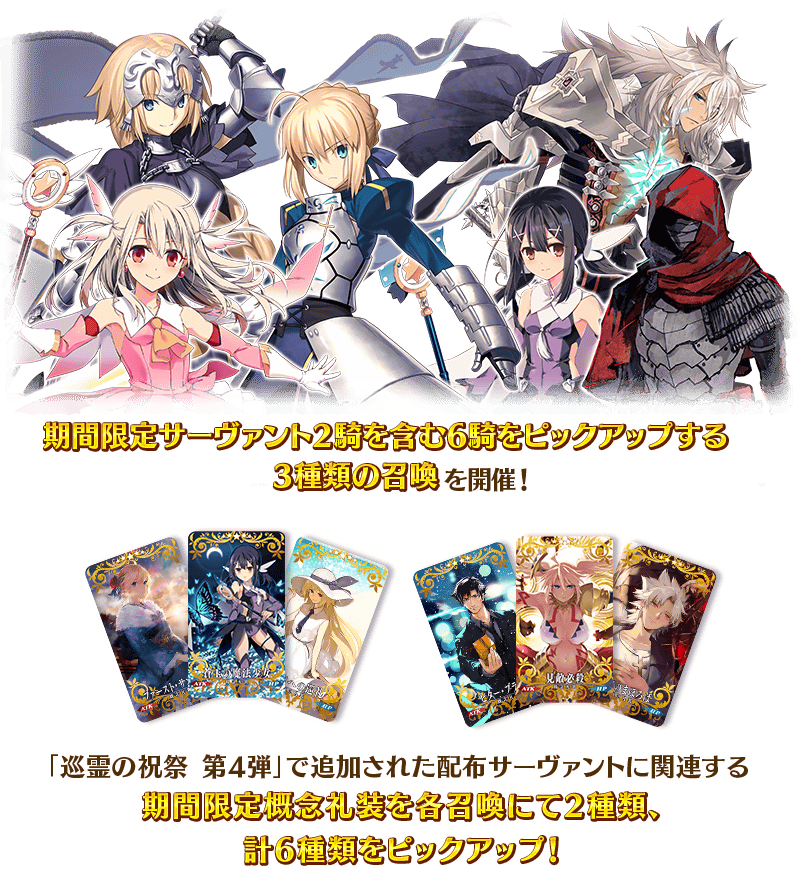 「巡霊の祝祭 第4弾」で追加された配布サーヴァント3騎と関連するサーヴァントの中から、期間限定サーヴァント2騎を含む6騎をピックアップする3種類の召喚を開催いたします!