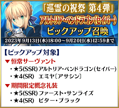 ・期間限定ピックアップ召喚において、329回以内にピックアップ対象の★5(SSR)サーヴァントが召喚されなかった場合、330回目の召喚をおこなった際に1度だけピックアップ対象の★5(SSR)サーヴァントを必ず1騎「確定召喚」できます。