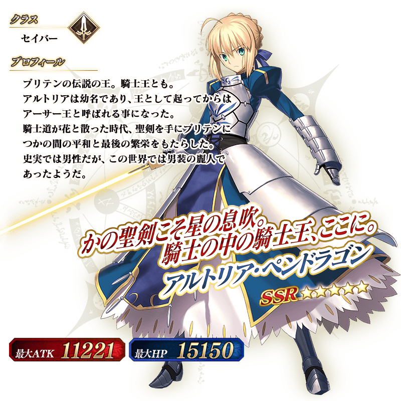 ※上記の「★5(SSR)アルトリア・ペンドラゴン(セイバー)」のイラストは霊基再臨第2段階のものです。