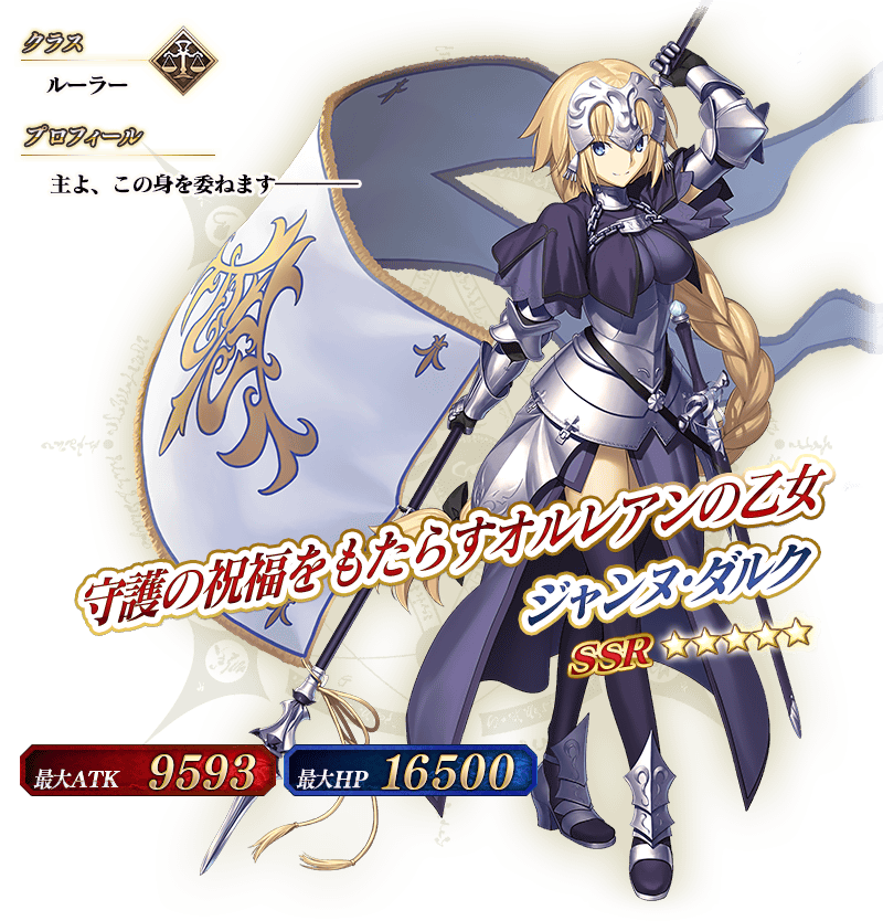 ※上記の「★5(SSR)ジャンヌ・ダルク(ルーラー)」のイラストは霊基再臨第2段階のものです。